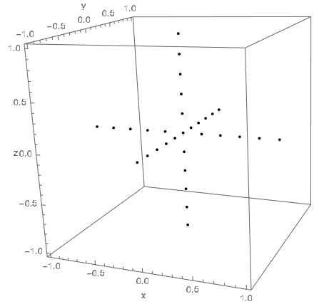 Każdy punkt o numerze \(i\) ma wapółrzędne \(r_{i}\), masę \(m_{i} = 1\) (dowolna jednostka masy), każde ramię krzyża ma długość \(2\) (dowolna jednosta odległości) a punkty są rozmieszczone co \(0.2\) (dowolna jednostka odległości).